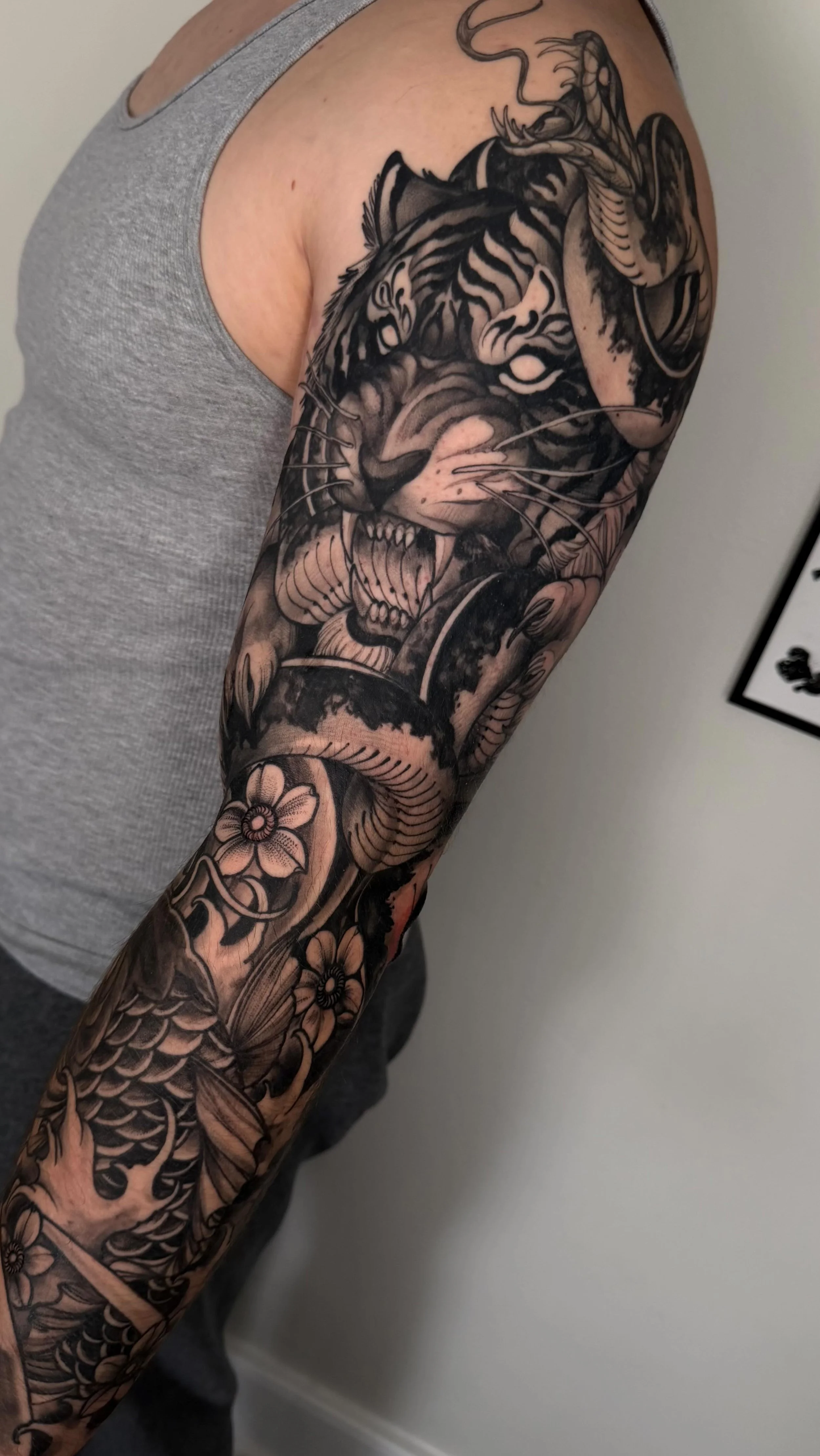 Originally from Los Angeles, Dylan moved to Richmond in 2022. He specializes in neo-traditional black and grey. He is best known for his work featuring warriors, women, and wild beasts. His style is punctuated with bold lines, whip shading, and high-contrast values.